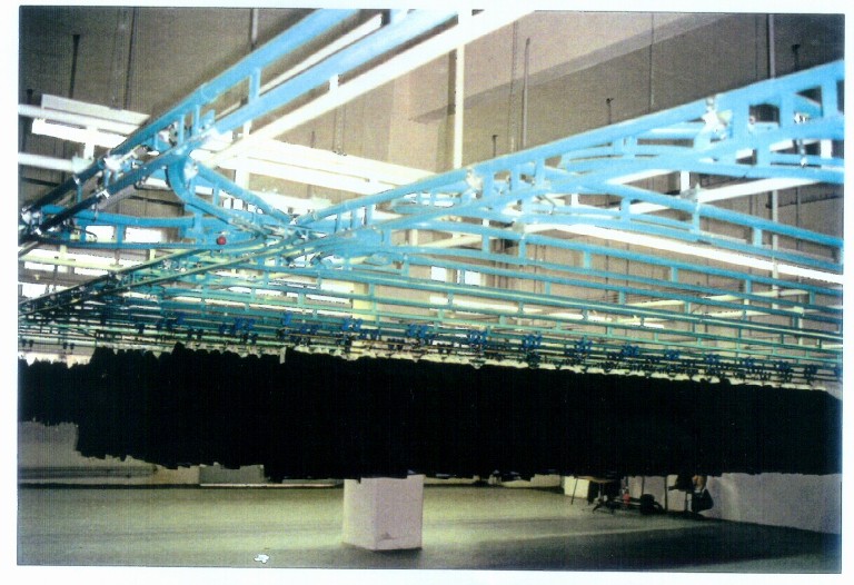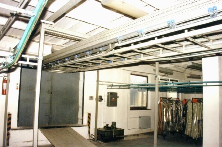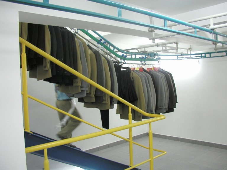 Die Hängefördereranlage ist besonders für die Bekleidungsproduktionen in die Bügelei